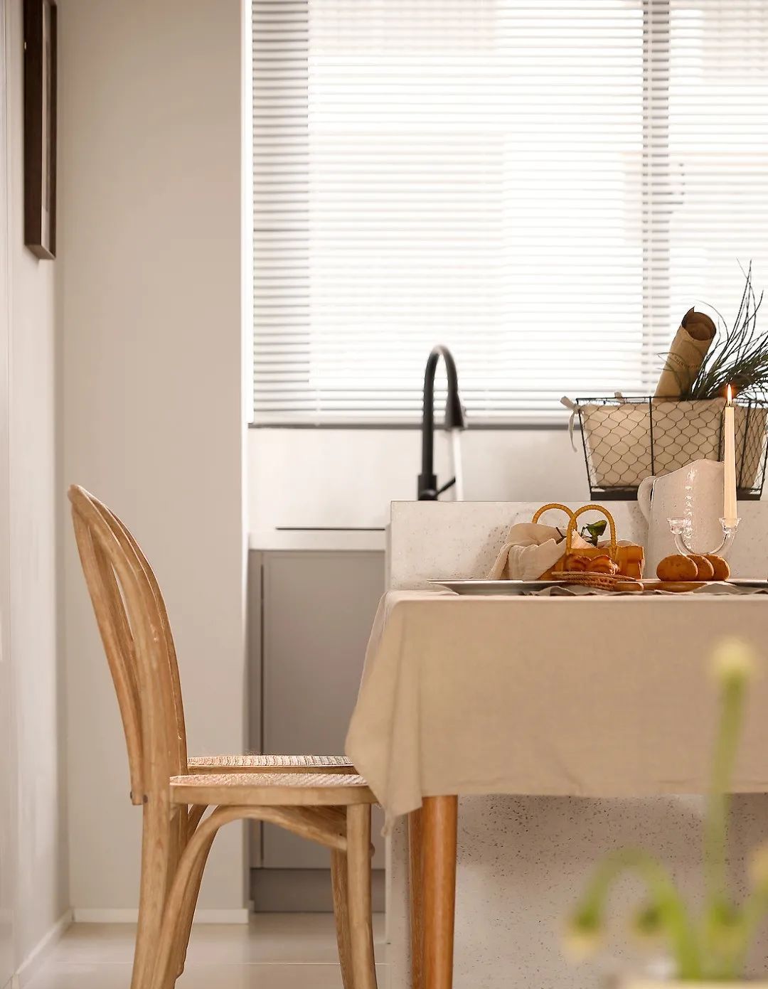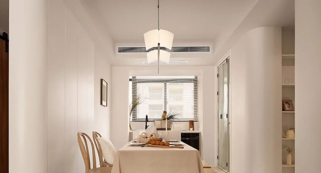 把餐厅的阳台利用起来,在窗下设置了西厨,简单的白色百叶帘,保证了空间的隐私的同时,又让光影达到了和谐。