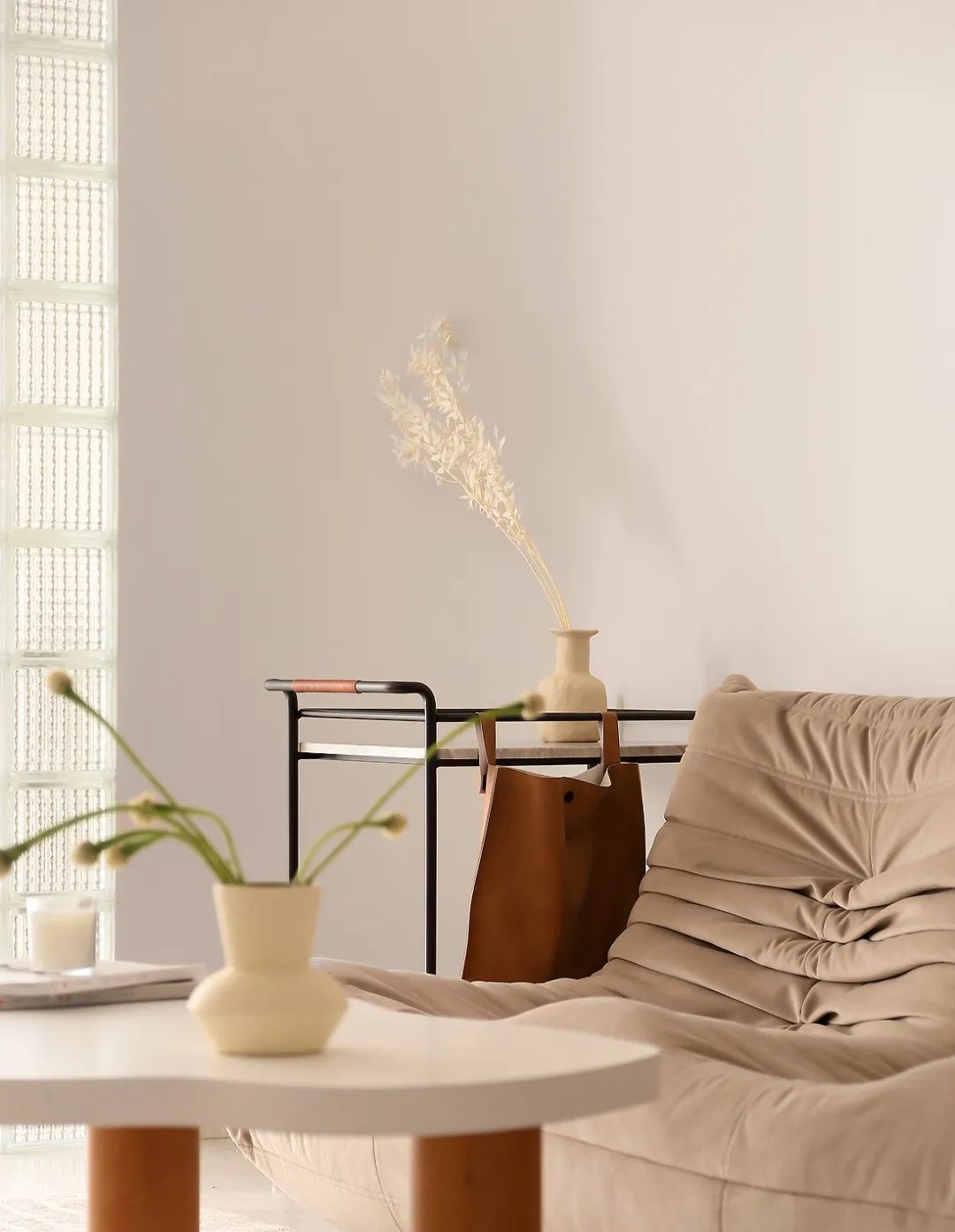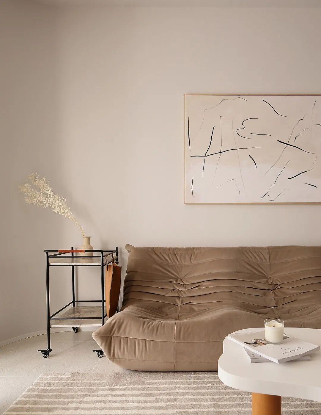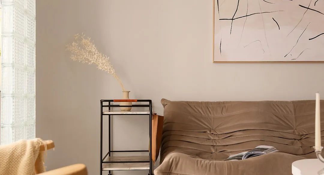 摆件配饰大多是基础颜色的点缀。边几上一只花瓶插一枝花,很好的留白了空间。搭配浅灰的布艺沙发,形成一种优雅的时尚感。