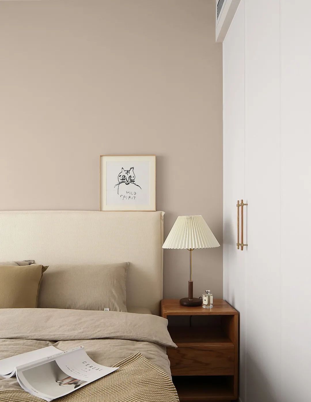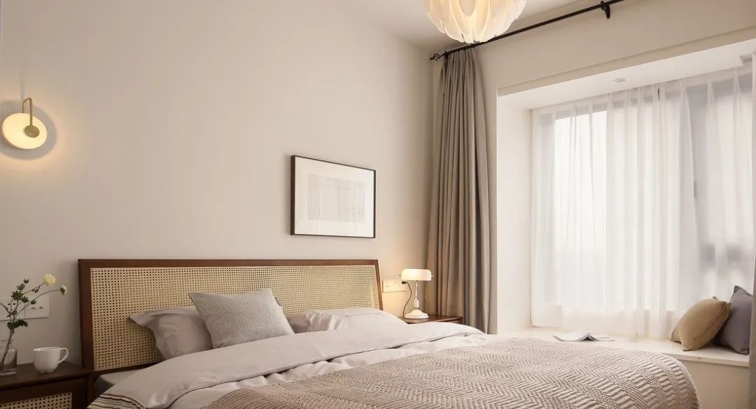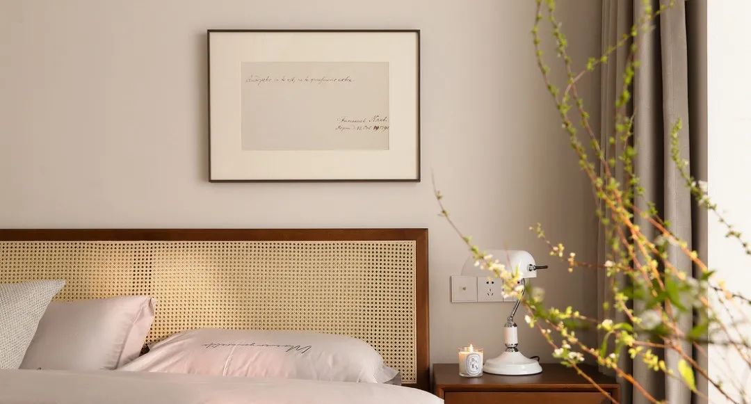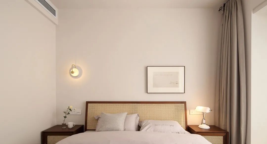 家具也都是延续了客餐厅的原木风格,搭配温柔的灰色,大面积留白,使卧房更加温润明亮,营造理想的睡眠环境;整面的储物柜保证房间的干净整洁。