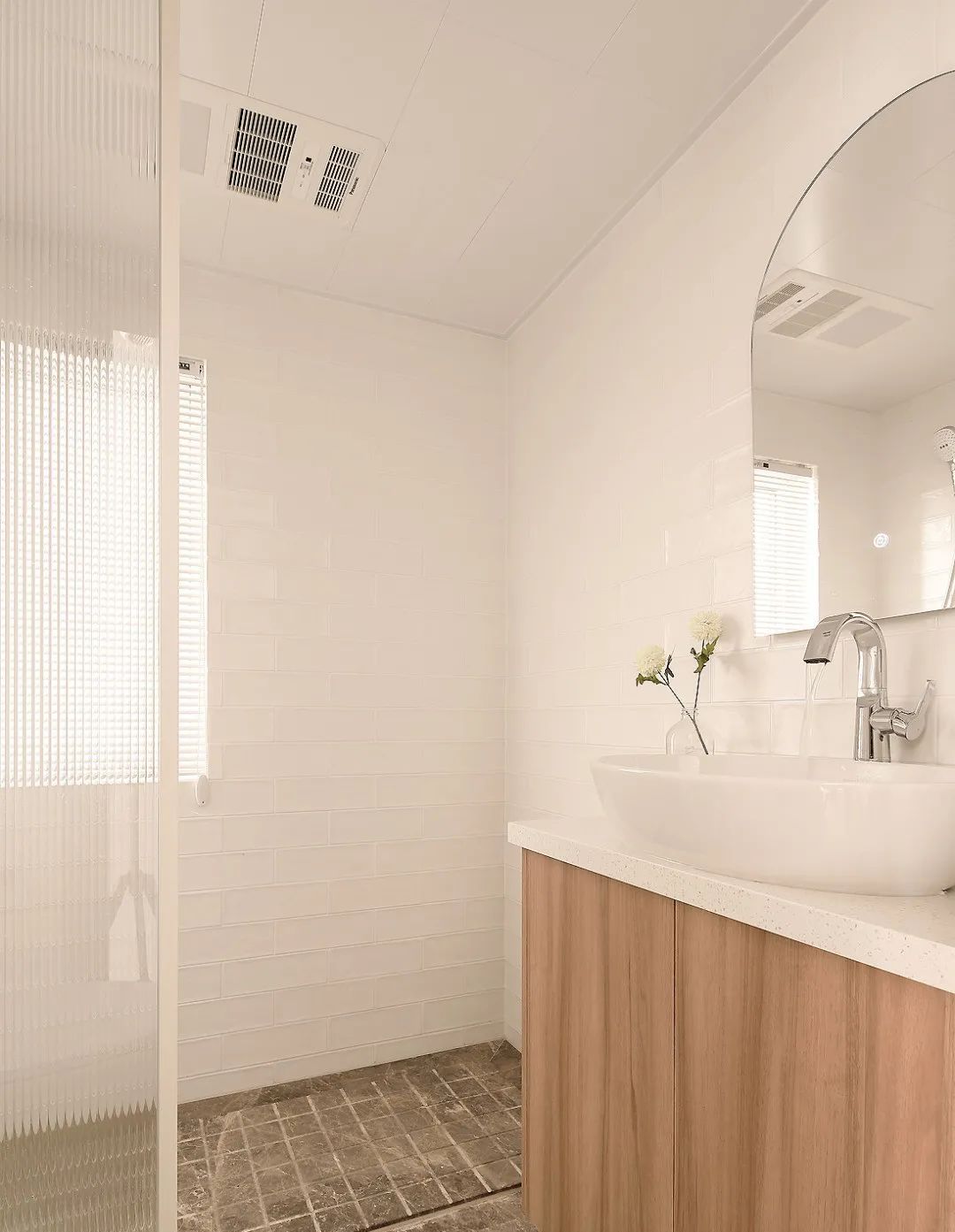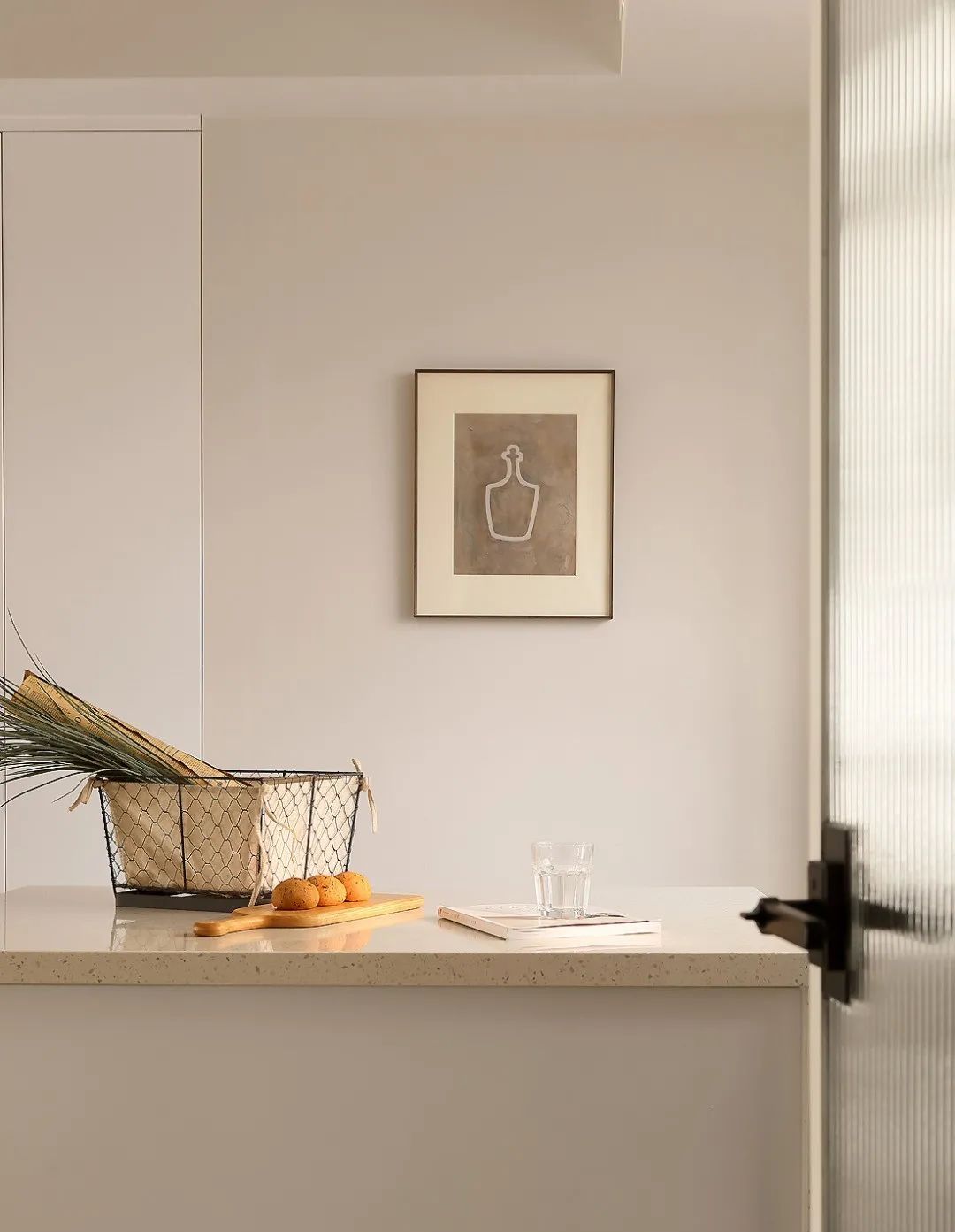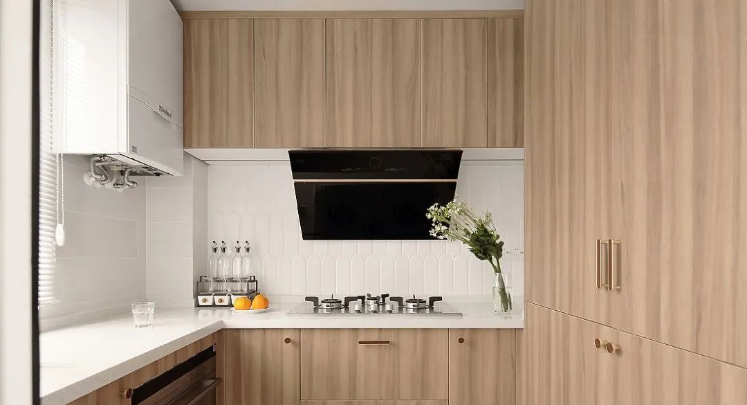 餐厨之间用白框玻璃推拉门作为隔断,提升厨房采光效果,还能隔绝油烟。内部白色小方砖搭配原木色橱柜,整体显得既简约又有清新的舒适感~