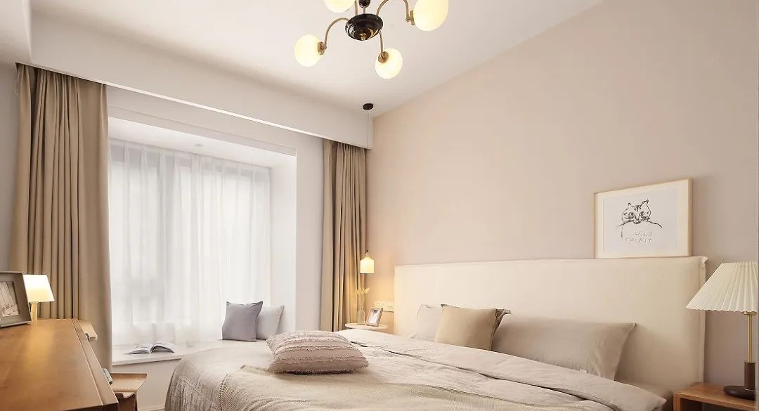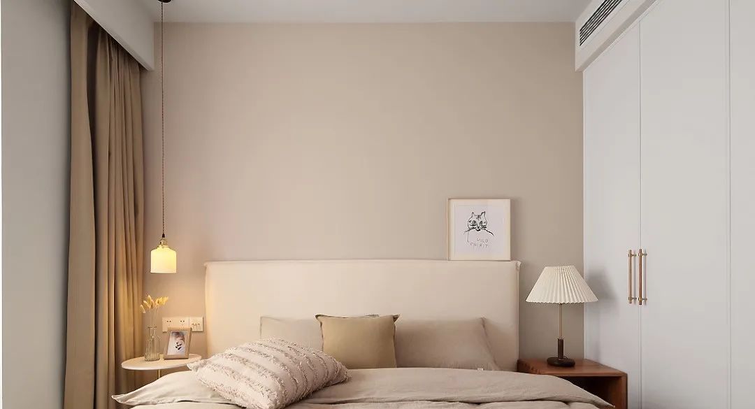 主卧以简约舒适为主,非常自然素雅的卧室空间,衣柜与床都是白色,明快纯粹。吊灯和床头灯都给室内带来温暖舒适感。